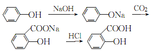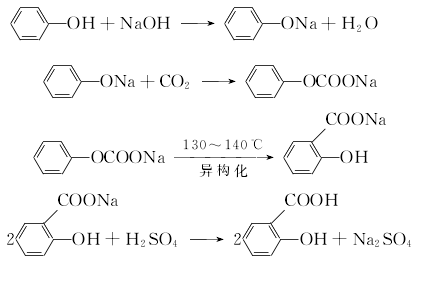 將酚用50%液堿中和,真空干燥,然后將釜溫冷卻至100℃,慢慢通入干燥的二氧化碳,當釜內壓力達0.7-0.8mpa時,停止通二氧化碳,此時生成碳酸酚酯鈉,然后在130-140℃下發生分子內重排異構化,變為水楊羧鈉,再用酸化,得水楊酸粗品。將粗品在減壓下升華,即得水楊酸精品,含量99%,收率達98%以上。消耗定額(kg/t):酚(98%)704,燒堿(95%)417,(95%)500,二氧化碳(99%)467。 (3)制法 酚與氫氧化鈉反應生成酚鈉鹽,然后再與二氧化碳合成鄰羥基甲酸鈉,經酸化制得水楊酸: