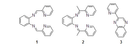 鄰二胺與2-吡啶甲醛反應時得到的是n4席夫堿配體1[1],但是當把2-吡啶甲醛換成2-乙酰基吡啶時,以氯甲酸甲酯為催化劑,在異丙醇中反應沒有得到相應的n4席夫堿配體2,而是得到了并六元環產物即2-(2′-吡啶基)喹喔啉3[2]