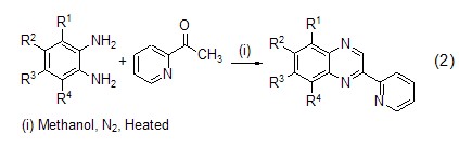 利用鄰二胺及其衍生物與2-乙酰基吡啶為原料,以對磺酸為催化劑,在甲醇溶劑中,加熱 (50~60 oc) 攪拌反應10~20 h卻得到了并六元環產物 (式2)[4,5]