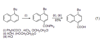 羧基的引入 在alcl3催化下,dpc-cl 可在芳環(huán)上引入一個羧基。烷基或烷氧基取代的芳環(huán)容易發(fā)生反應(yīng)。產(chǎn)物二基酰胺用堿水解,再酸化可得到羧酸 (式1)[1]。