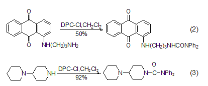 與氨基的反應(yīng) dpc-cl易與一級 (式2)[2]、二級脂肪胺 (式3)[3] 等反應(yīng)[4~7]。