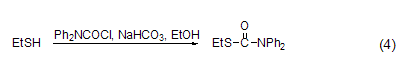 與巰基的反應(yīng) 在堿性條件下 (如nahco3),在溶液中dpc-cl可與硫醇反應(yīng) (式4)[8]。