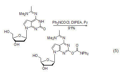 用作寡聚核苷酸合成時的保護(hù)基 在合成寡聚核苷酸時,鳥嘌呤核苷的堿基容易發(fā)生副反應(yīng),需要加以保護(hù),dpc-cl可以將鳥嘌呤堿基的烯醇異構(gòu)體酰基化而對其進(jìn)行保護(hù),這種方法在合成具有鳥嘌呤堿基和與鳥嘌呤堿基類似的核苷化合物時[9~12],發(fā)揮著重要作用 (式5)。